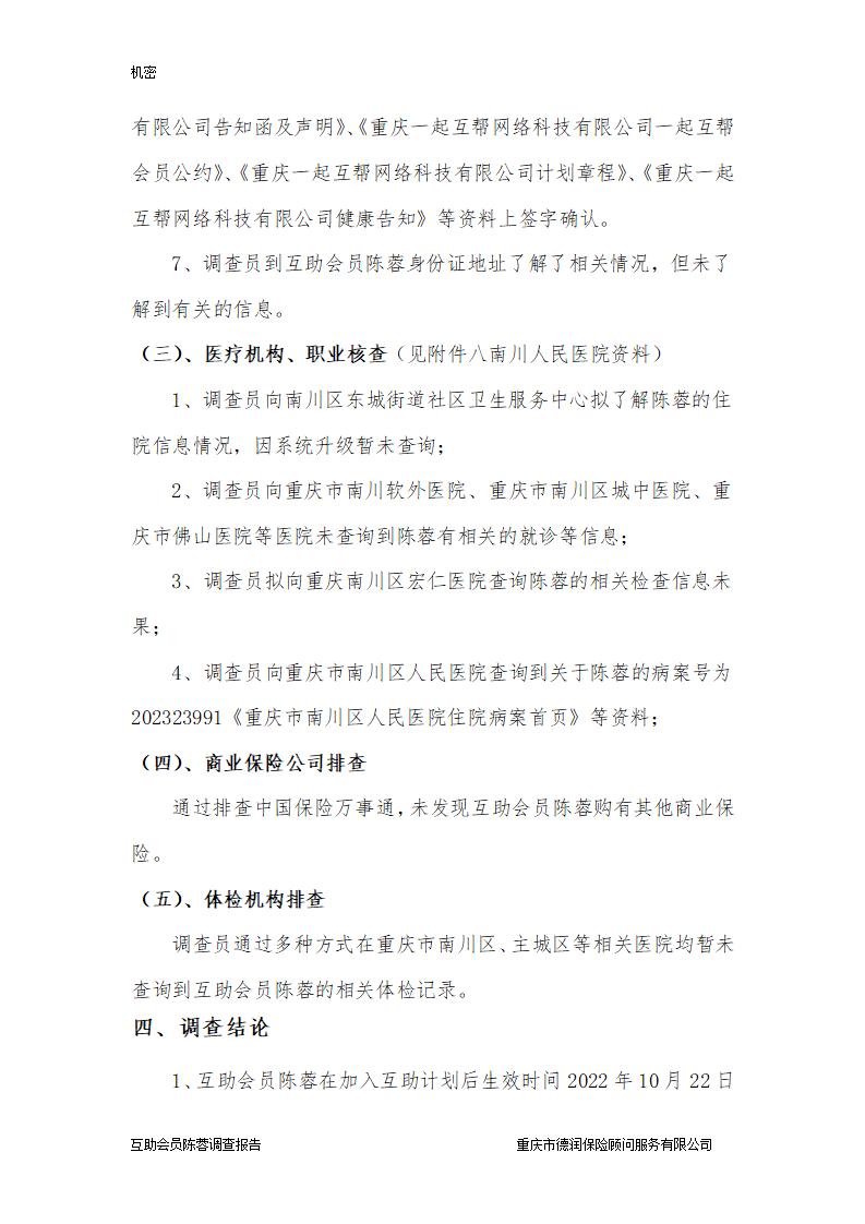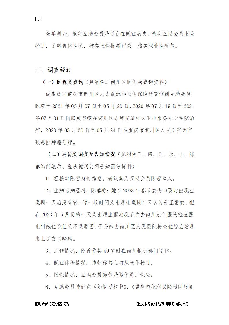 调查员通过面访本人及家属,走访其就诊医院及其它可能就诊的医院,排查既往病史,核查其医保、商保,发现未有不符合互助条件的情形。
