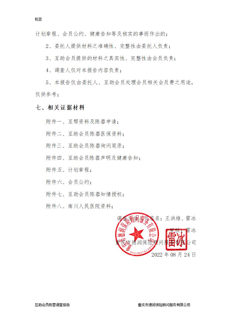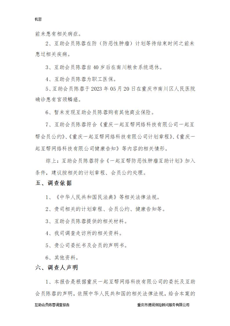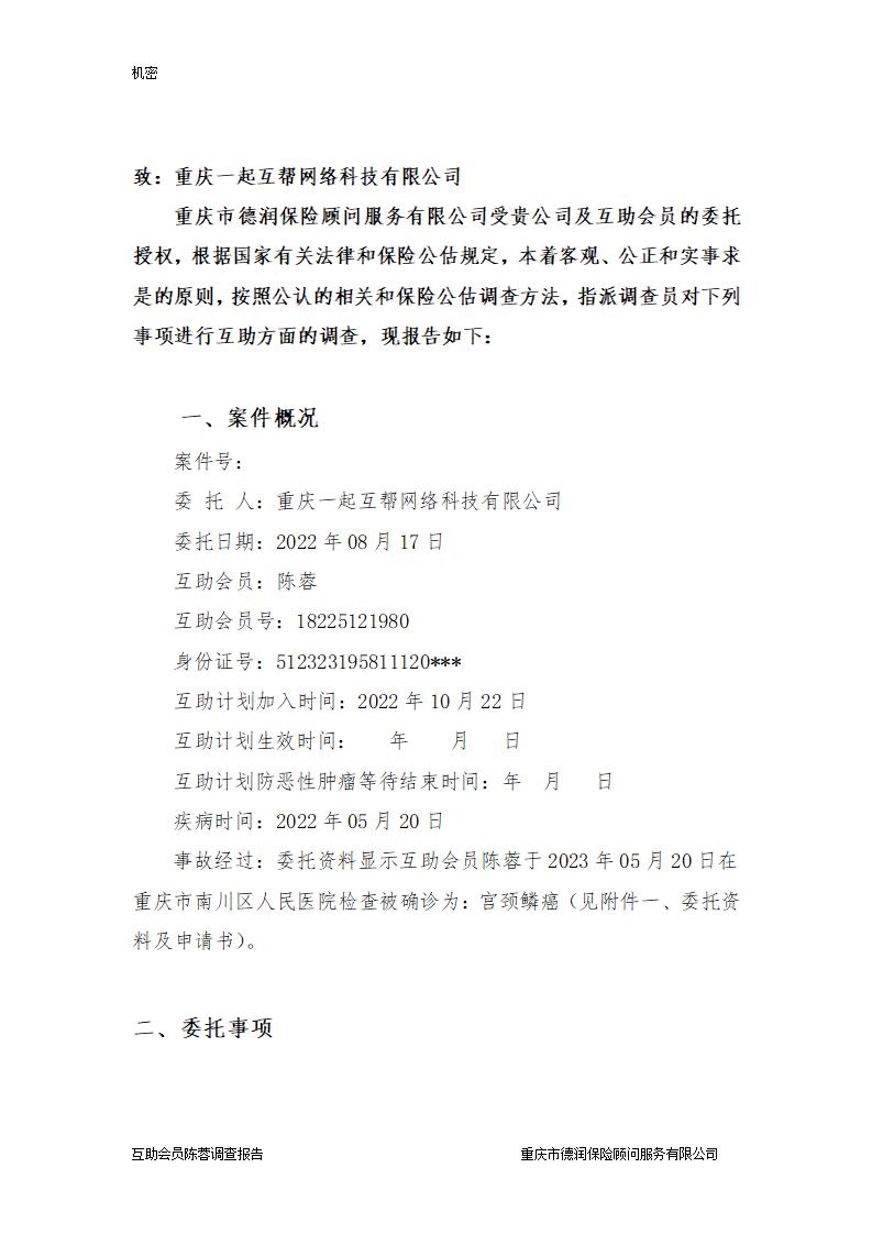 互助金申请人陈蓉,是一起互帮互助会员,于2023年05月20日在重庆市南川区人民医院检查被确诊为:宫颈鳞癌(见附件一、委托资料及申请书)。经调查符合一起互帮防癌互助计划一般互助标准。