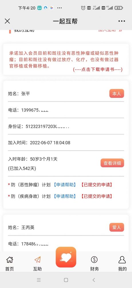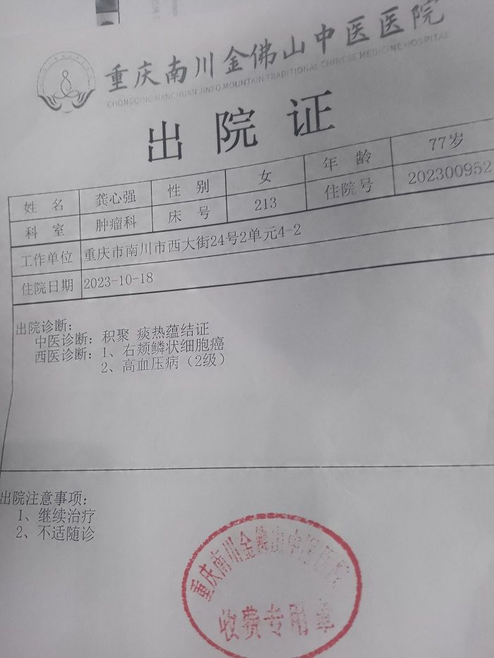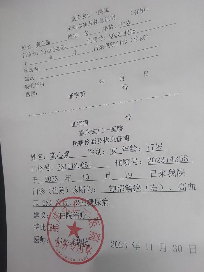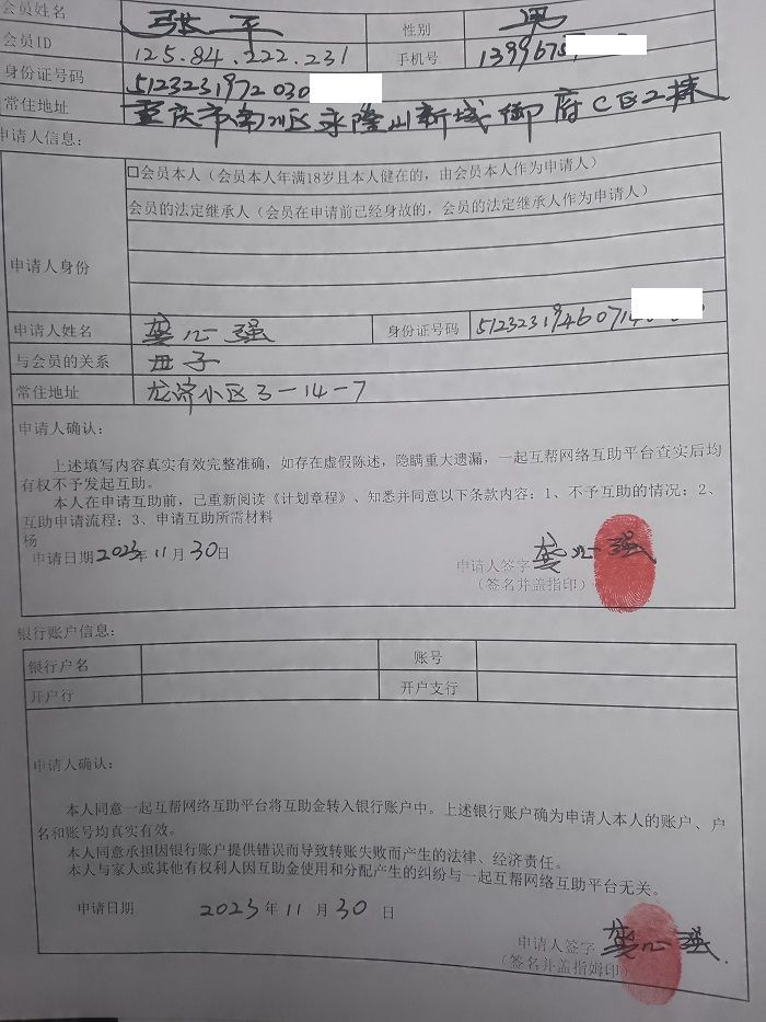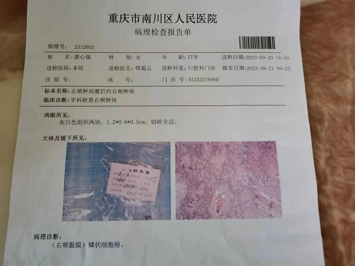 本人张平是一起互帮会员,母亲龚心强也是一起互帮会员,2023年9月20日去重庆市南川区人民医院检查出鳞状细胞癌,特申请互助。