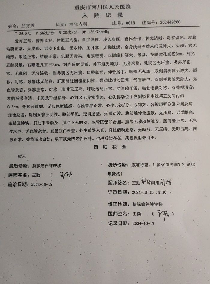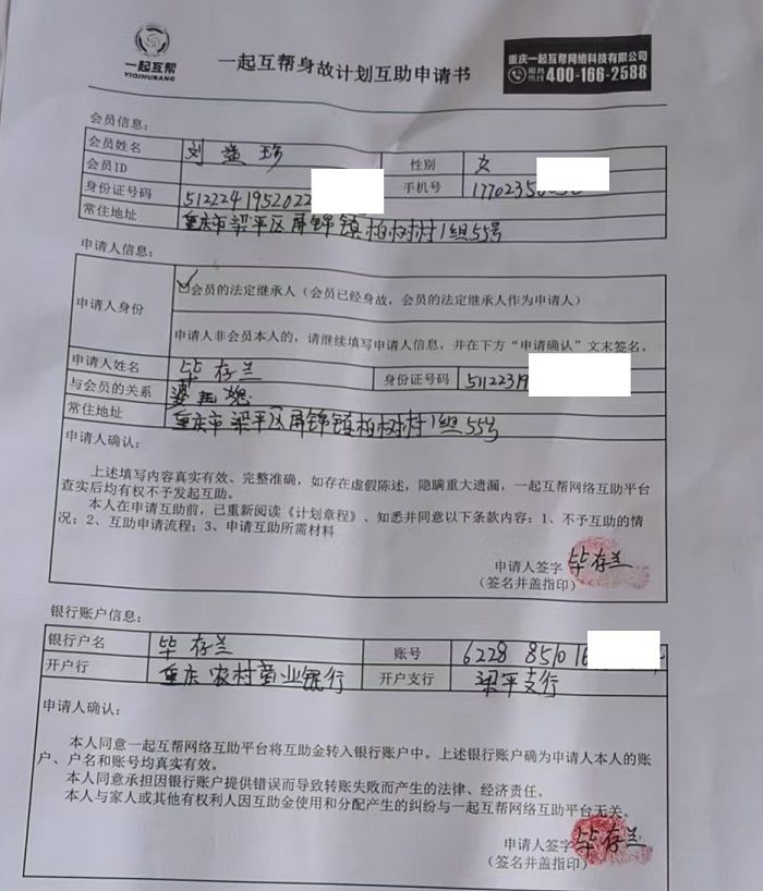 本人兰方英是一起互帮有效会员,于2024年10月18日在重庆市南川区人民医院确诊腺癌,现向一起互帮平台申请防癌互助金帮助。
