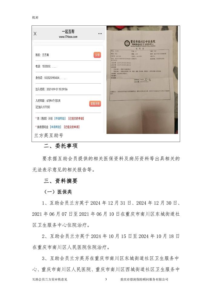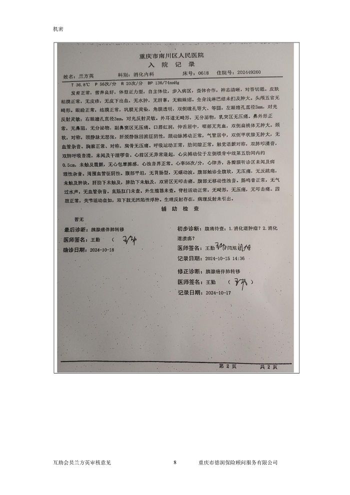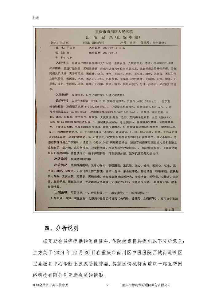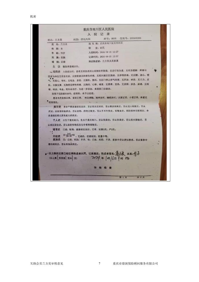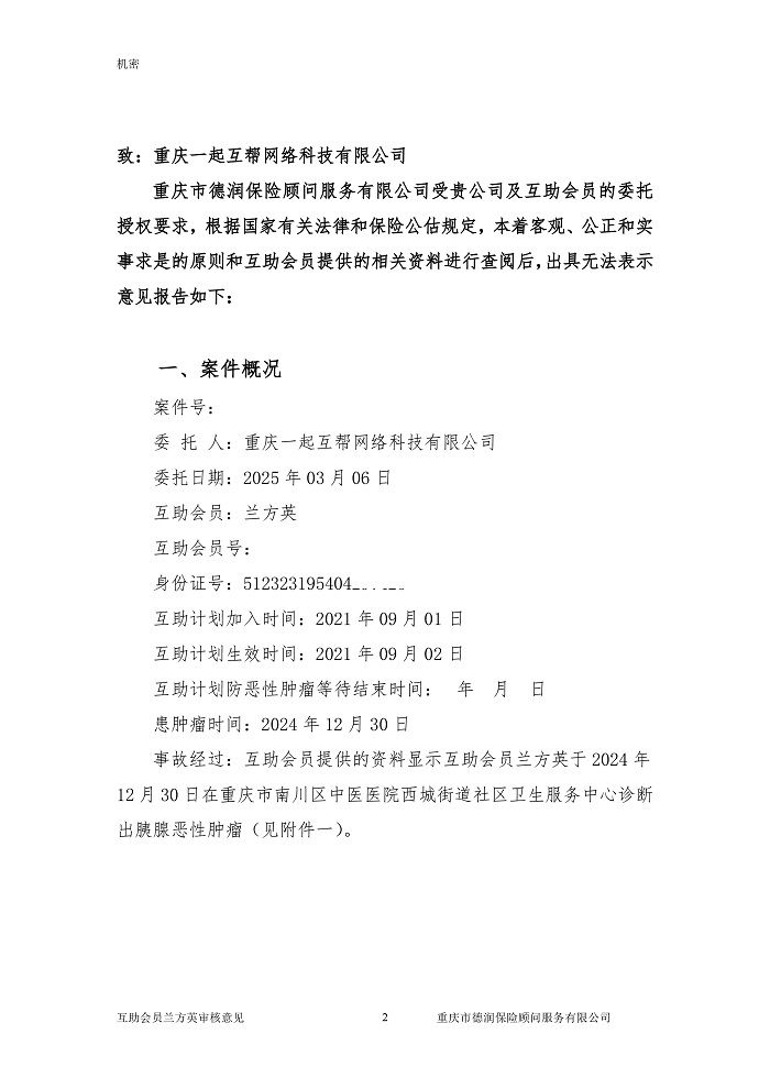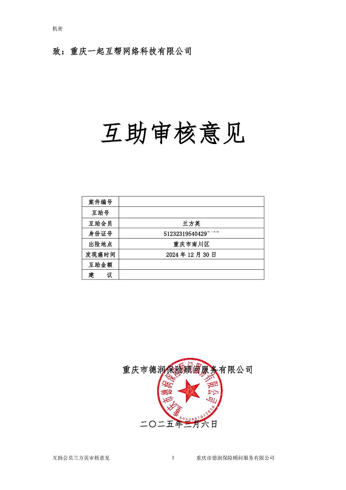 申请人蒋文兰是一起互帮有效会员,母亲兰方英也是一起互帮有效会员,于2024年10月18日在重庆市南川区人民医院确诊腺癌,现向一起互帮平台申请防癌互助金帮助。