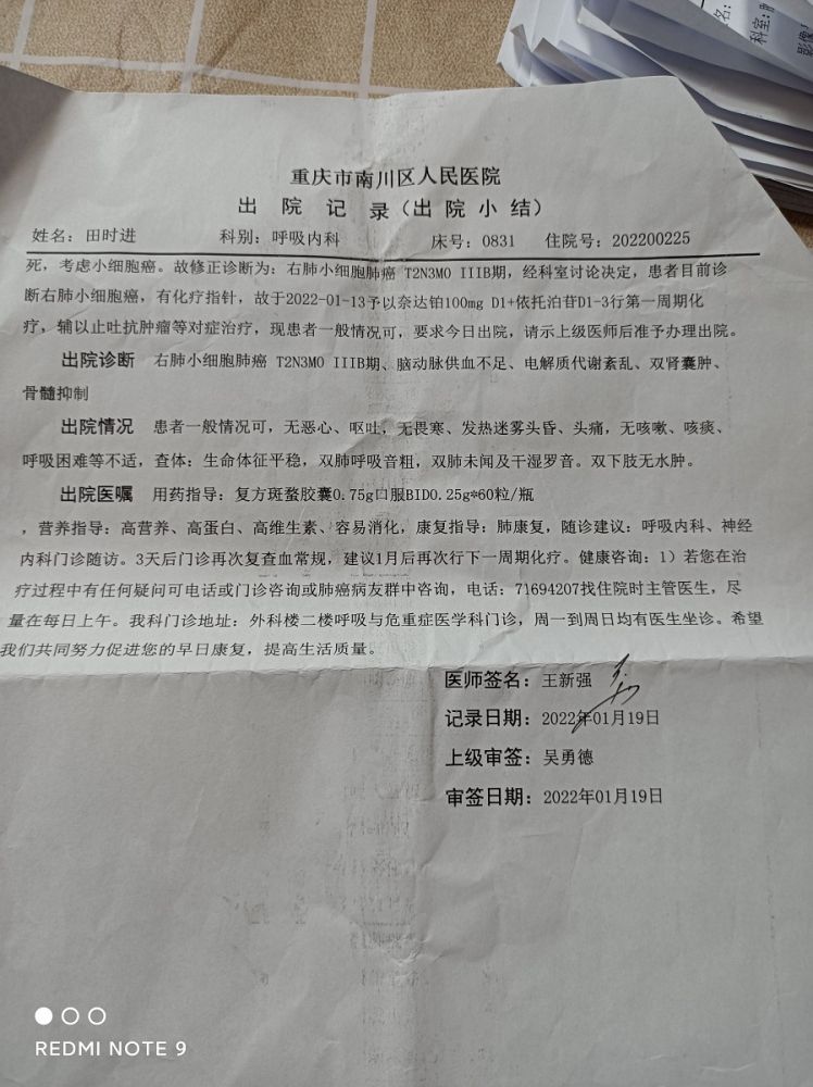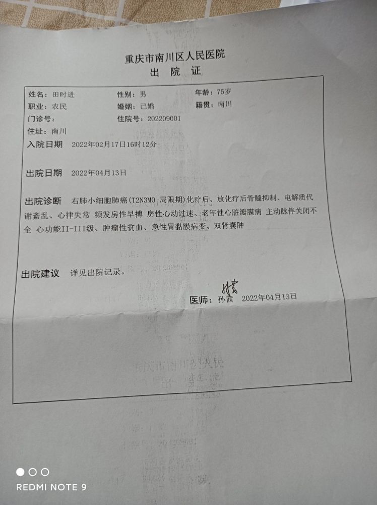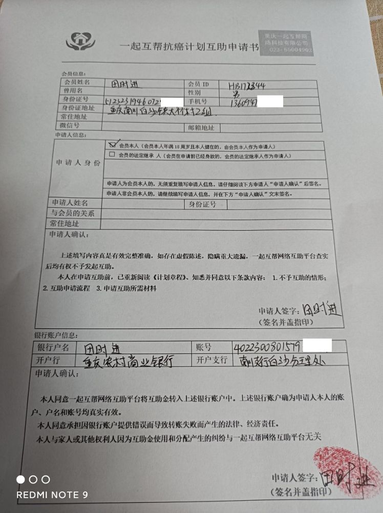 我是一起互帮互助会员余长江,我于2020年12月30日加入一起互帮,并把继父添加到一起互帮,2022年4月13日因不适去重庆市南川区人民医院住院检查,被确诊为右肺小细胞肺癌,现向一起互帮平台申请互助金帮助。